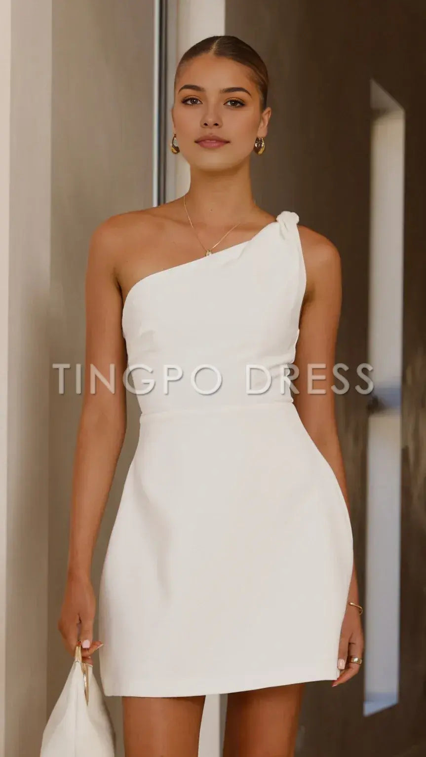 This chic one - shoulder white dress is a versatile gem for proms and various events. The asymmetric neckline adds a modern, sophisticated touch, while the structured bodice and flared skirt create a flattering silhouette. Made from smooth, quality fabric, it offers both comfort and a polished look. The mini length brings a youthful, playful vibe, perfect for dancing at proms or making a stylish statement at cocktail parties. Effortlessly blending elegance and contemporary design, this dress ensures you stand out with grace and charm at any formal gathering.