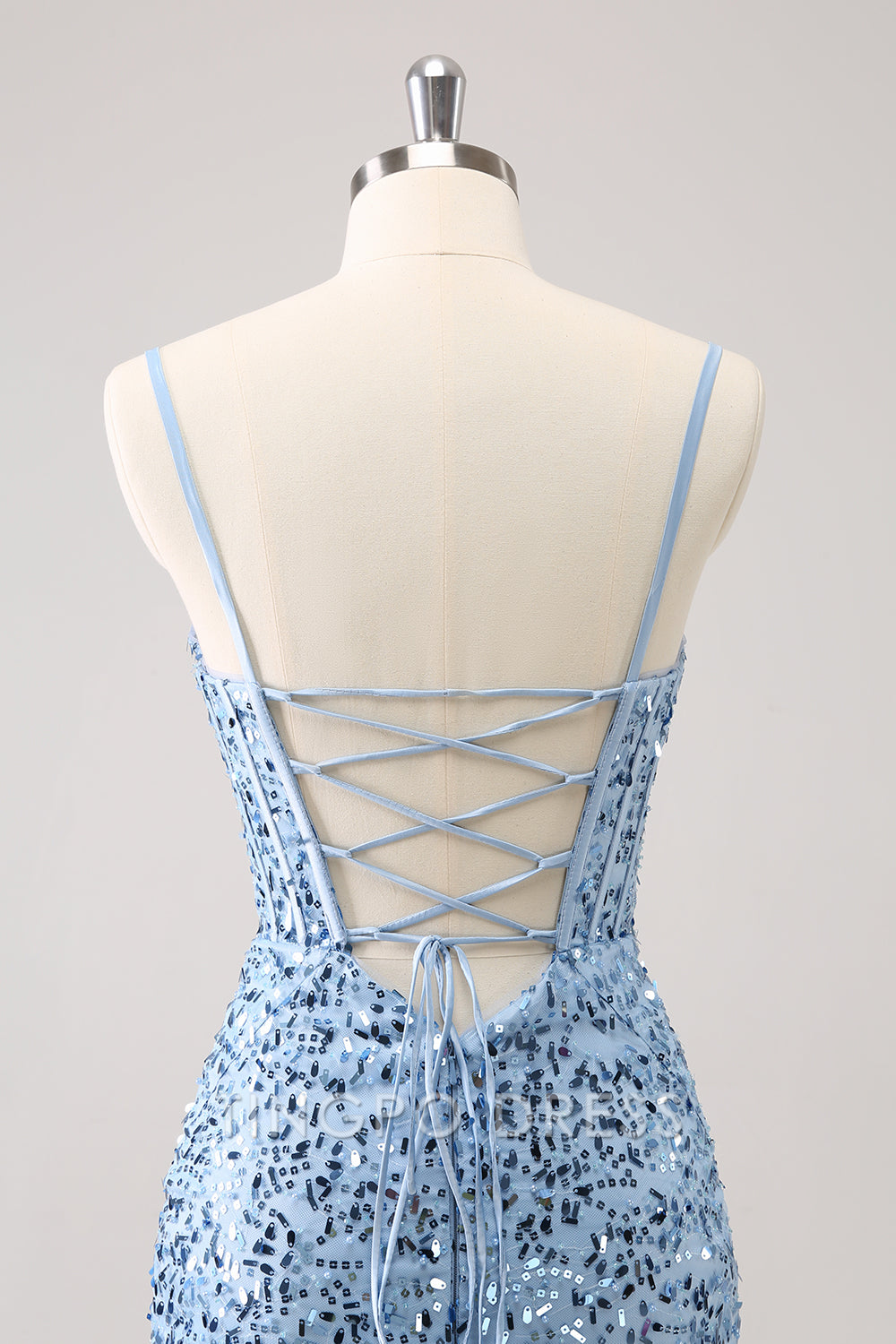 TingPo Wholesale Elegant Sparkly Blue Tight Sequins Spaghetti Straps Homecoming Dress formal wear dresses