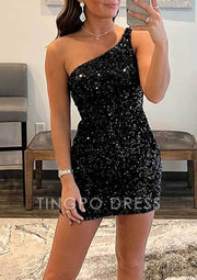 TingPo Wholesale Sparkling One-Shoulder Velvet Sequins Sheath Short Homecoming Dress