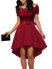 Wholesale Women's Cocktail Party Dress Lace Dress Wedding Guest Dress Black Dress Knee Length Dress White Pink Wine Short Sleeve Pure Color Lace Fall Spring Off Shoulder - Wine / US 2 / UK 6 / EU 32