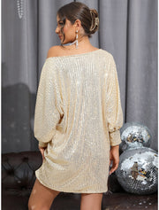 Wholesale Women's Gold Sequin Dress Party Dress Sparkly Dress Holiday Dress Shift Dress Short Mini Dress White Black Long Sleeve Fall Spring One Shoulder Stylish Hot Loose