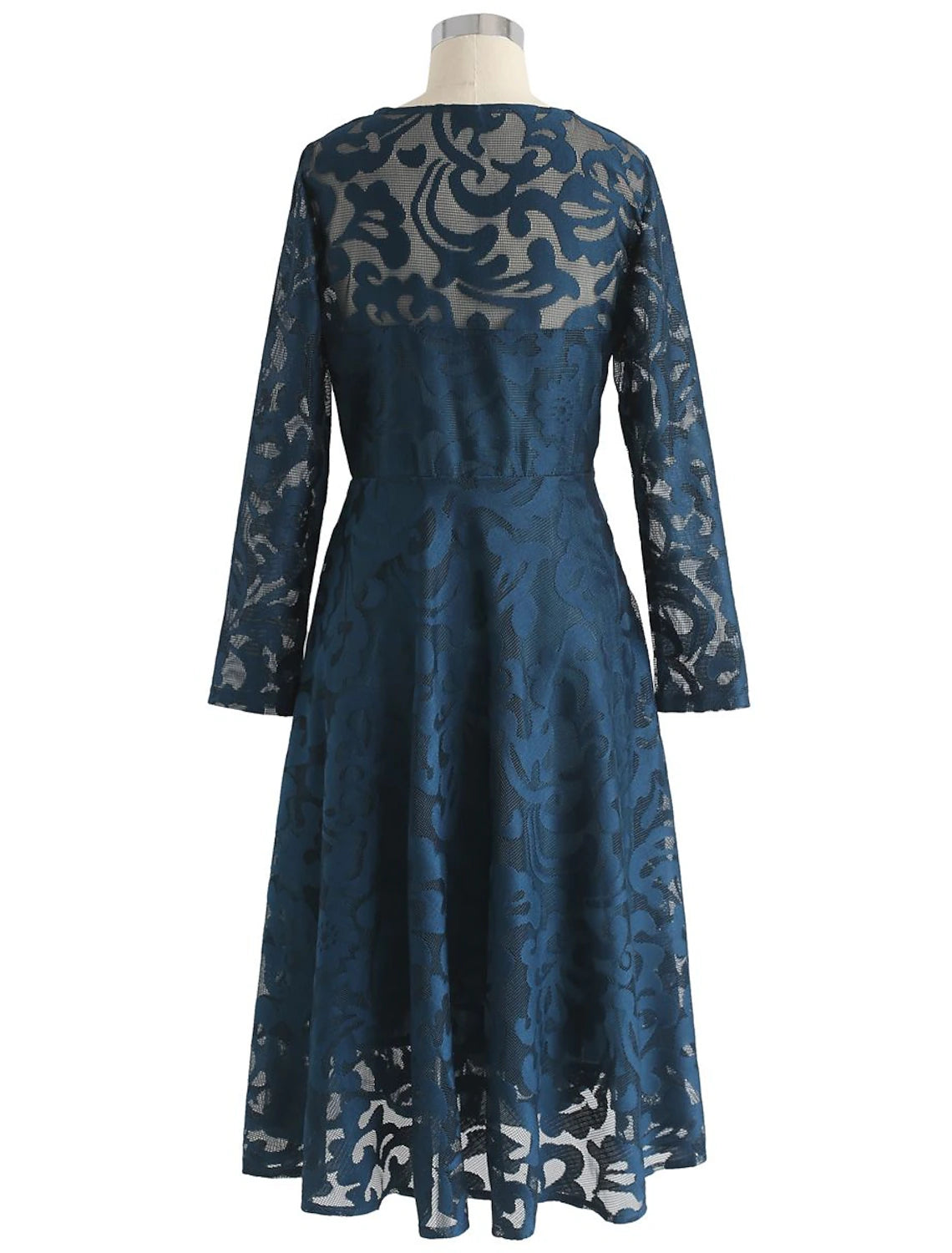 Wholesale Women's Party Dress Lace Dress Swing Dress Midi Dress Wine Red Black Blue Long Sleeve Pure Color Lace Winter Fall Spring Crew Neck Elegant Party Winter Dress Wedding Guest - Blue / US 2 / UK 6 / EU 32