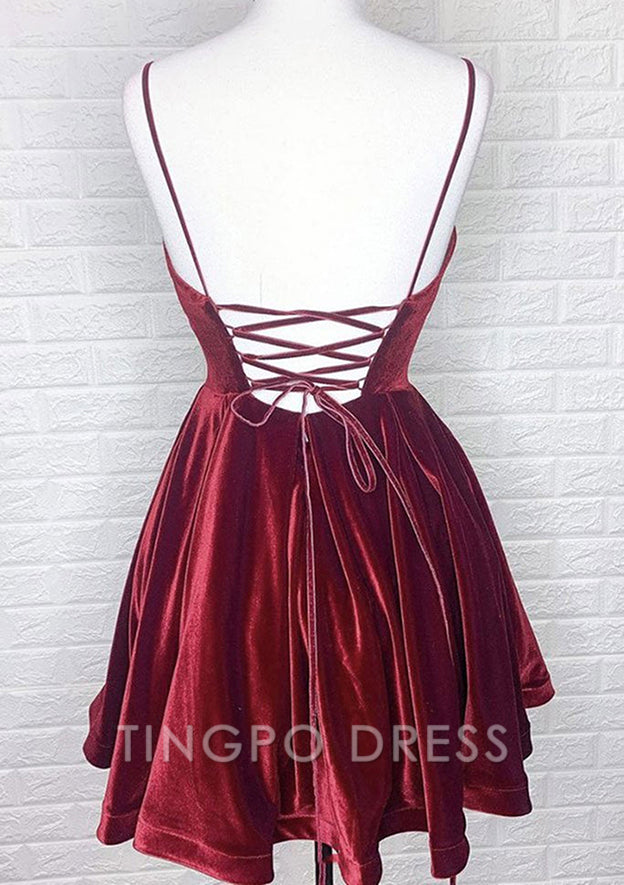 TingPo Wholesale A-line V Neck Sleeveless Satin Short/Mini Homecoming Dress With LaceRegular price $105.88