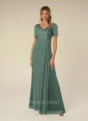 The is an elegant floor-length, A-line dress cut in mesh. The timeless dress has a simple V-neckline, features flattering draping, and has lightweight sleeves for arm coverage.