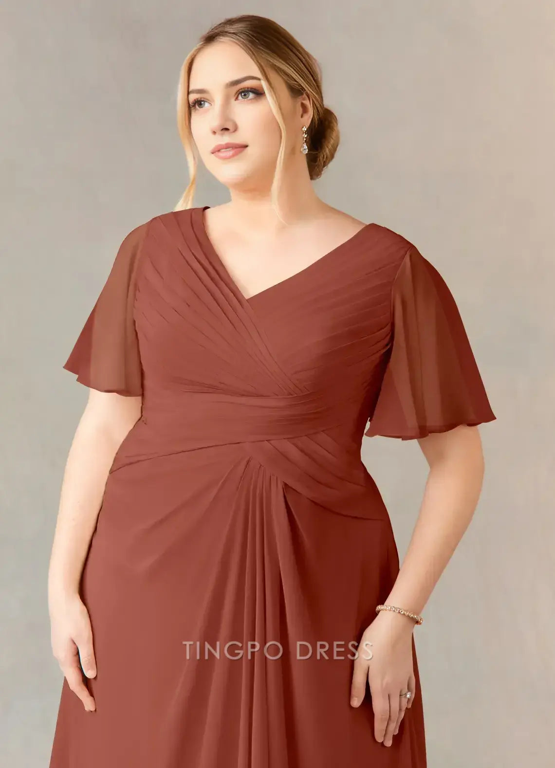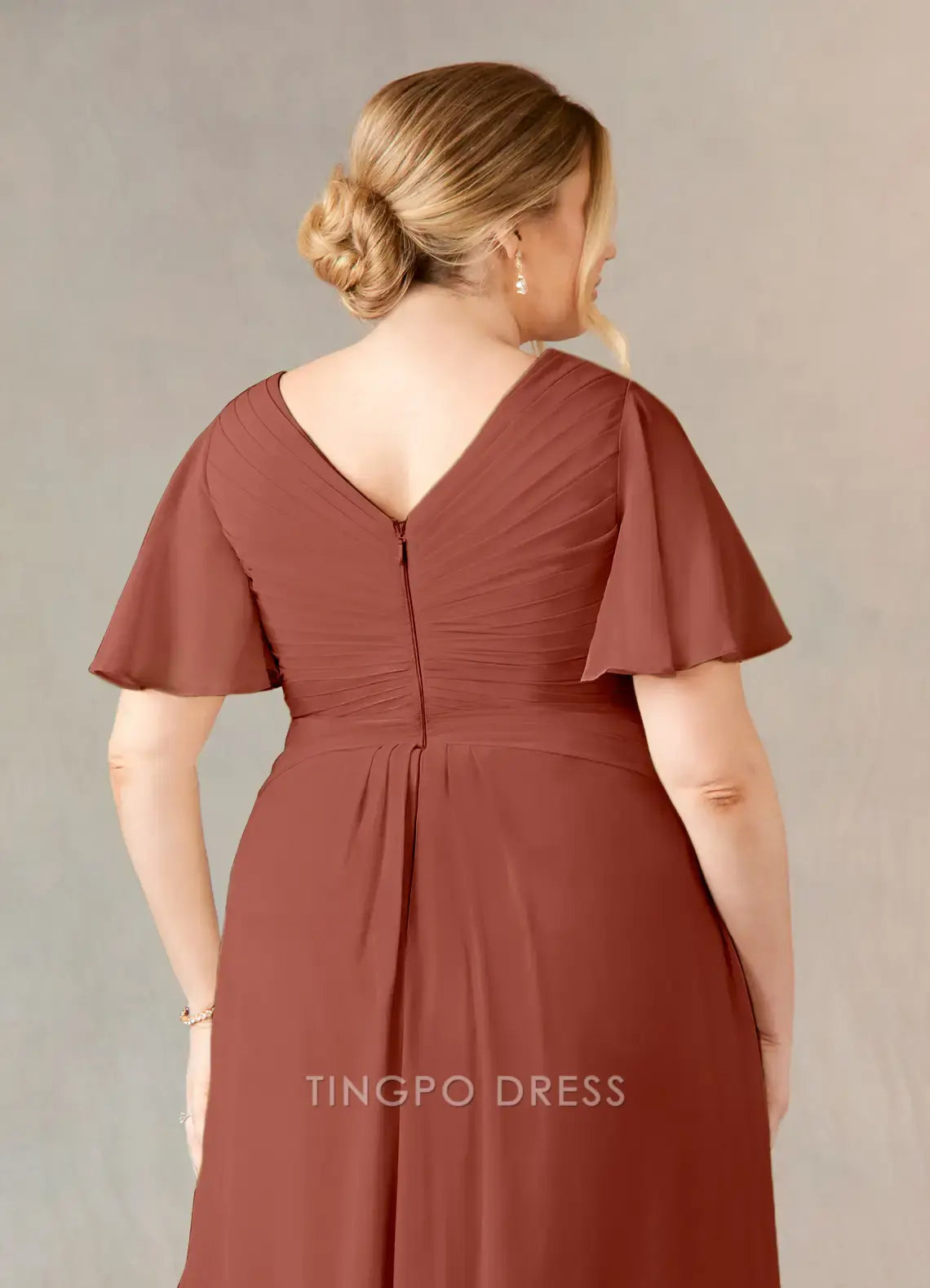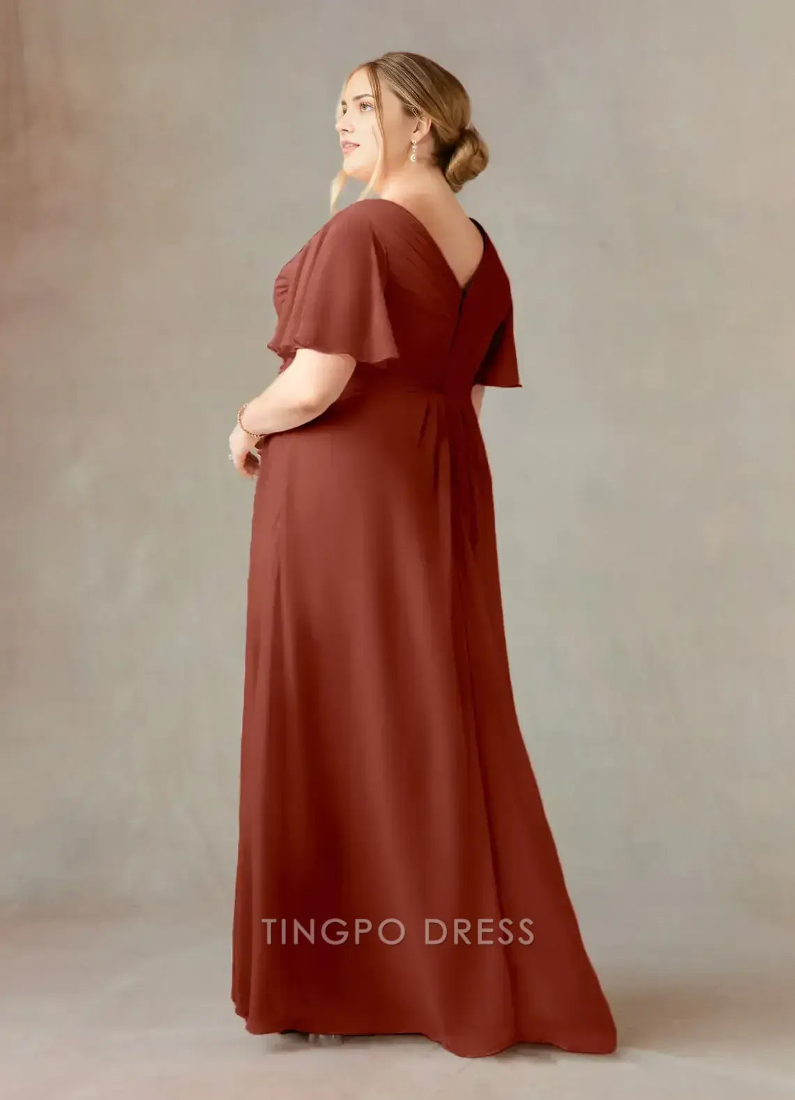 TingPo Wholesale Elegant Plus - Size V - Neck Chiffon Maxi Dress with Flutter Sleeves and Ruched Bodice for Formal Events