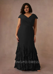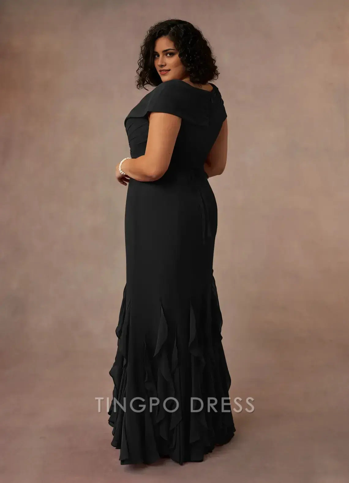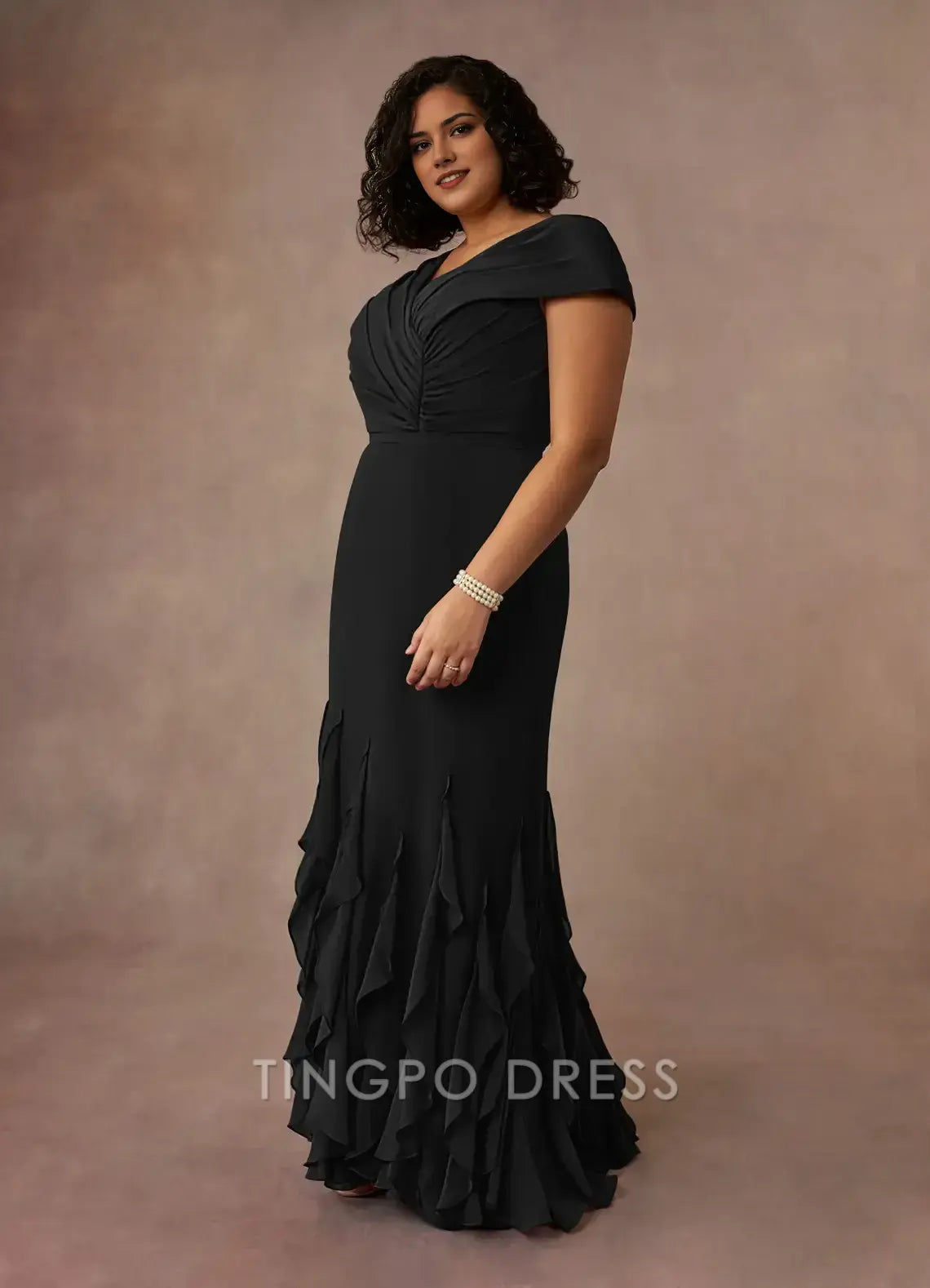 TingPo Wholesale Elegant Plus - Size V - Neck Mermaid Gown with Off - Shoulder Sleeves and Ruffled Hem for Formal Occasions