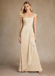 The is our romantic mesh design featuring a sweetheart neckline and cap sleeves adorned by delicate lace and a floor-length sheath skirt with a handkerchief ruffle detail. Wear this style to a wedding reception or your next special occasion.