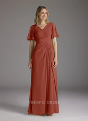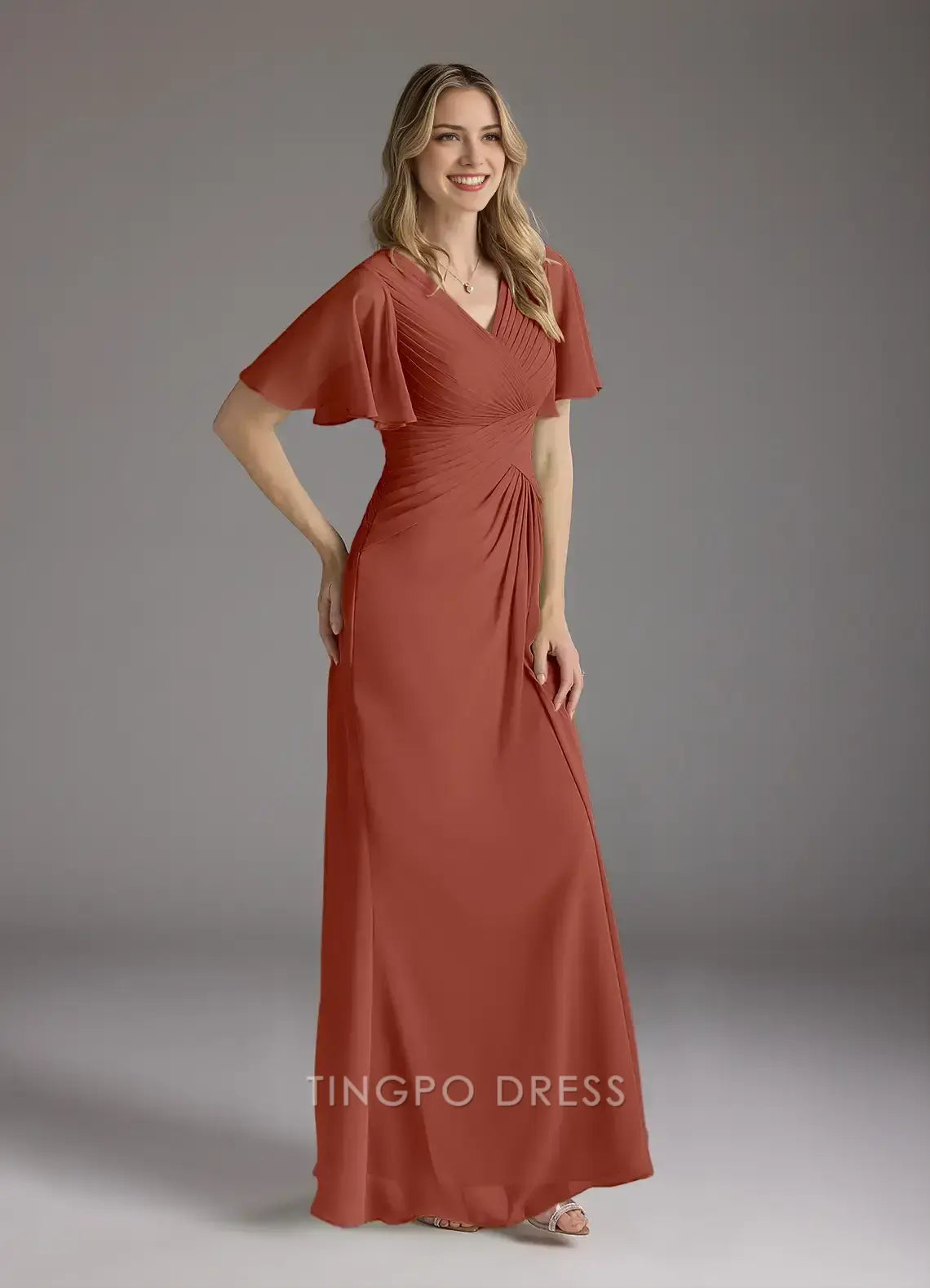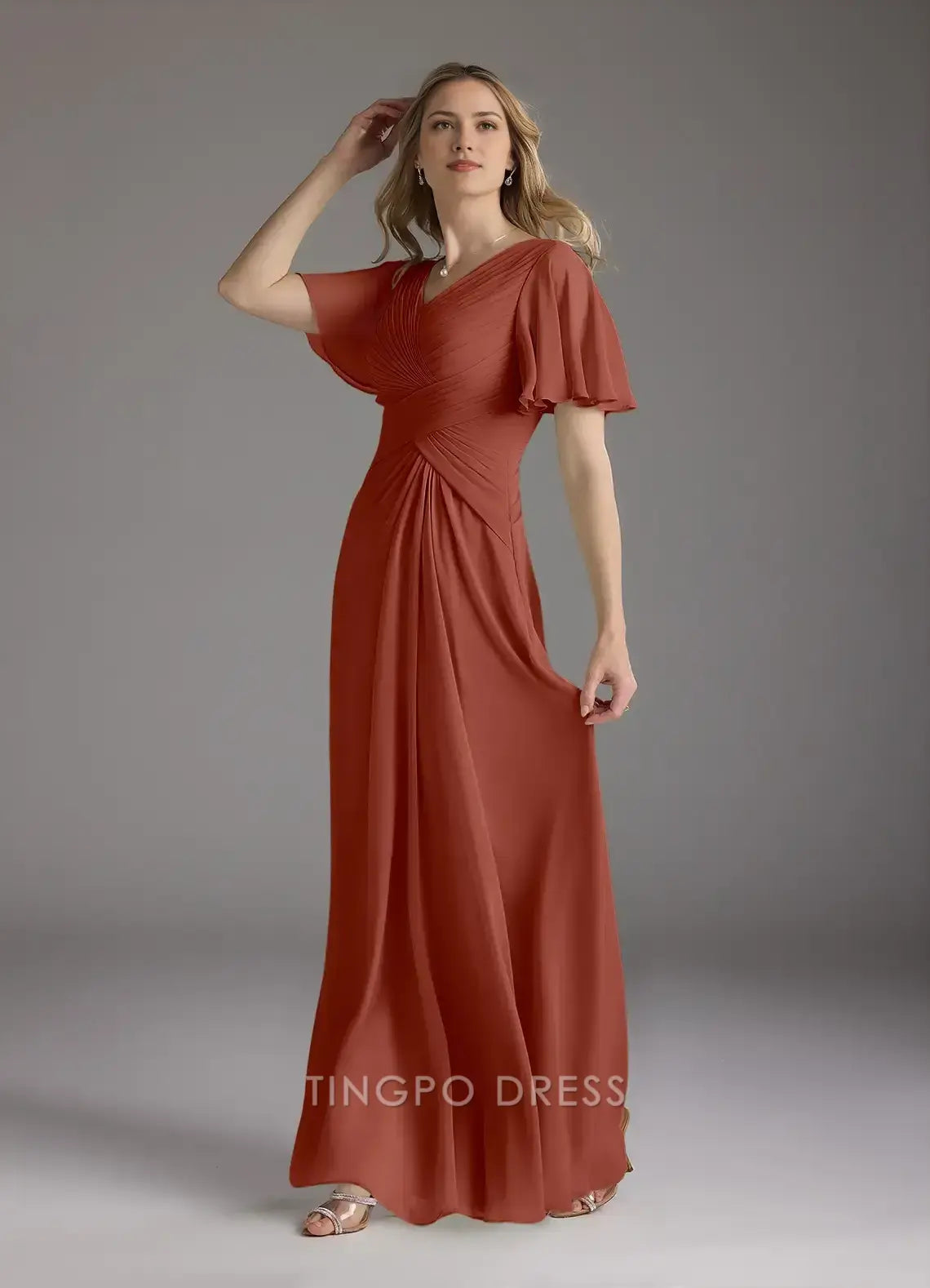 TingPo Wholesale Elegant V - Neck Chiffon Maxi Dress with Flutter Sleeves and Ruched Bodice for Formal Occasions