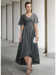 Wholesale A-Line Mother of the Bride Dress Elegant High Low V Neck Asymmetrical Chiffon Short Sleeve with Pleats Ruching