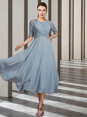 Wholesale A-Line Mother of the Bride Dress Elegant Jewel Neck Tea Length Chiffon Lace Short Sleeve with Ruching