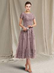Wholesale A-Line Mother of the Bride Dress Elegant Jewel Neck Tea Length Lace Tulle Short Sleeve with Appliques