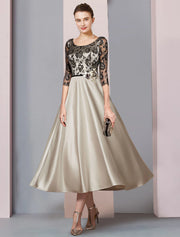 Wholesale A-Line Mother of the Bride Dress Formal Church Party Elegant Scoop Neck Tea Length Satin Lace Half Sleeve with Flower - US 2 / UK 6 / EU 32