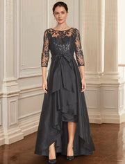 Wholesale A-Line Mother of the Bride Dress Formal Wedding Guest Elegant Black Dress Jewel Neck Asymmetrical Lace Italy Satin 3/4 Length Sleeve with Lace Bow(s) Sequin - US 2 / UK 6 / EU 32