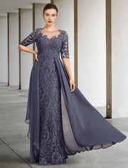 Wholesale A-Line Mother of the Bride Dress Formal Wedding Guest Elegant Scoop Neck Floor Length Chiffon Lace Half Sleeve with Bow(s) Sequin - US 2 / UK 6 / EU 32