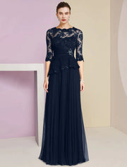 Wholesale A-Line Mother of the Bride Dress Formal Wedding Guest Elegant Scoop Neck Floor Length Chiffon Lace Half Sleeve with Pleats Appliques Crystal Brooch - US 2 / UK 6 / EU 32