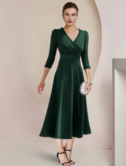 Wholesale A-Line Mother of the Bride Dress Formal Wedding Guest Party Elegant V Neck Tea Length Stretch Fabric 3/4 Length Sleeve with Beading Side-Draped - US 2 / UK 6 / EU 32