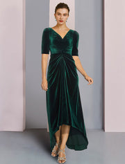 Wholesale A-Line Mother of the Bride Dress Wedding Guest Elegant High Low V Neck Asymmetrical Tea Length Velvet Short Sleeve with Ruched