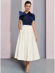 Wholesale A-Line Mother of the Bride Dress Wedding Guest Elegant Jewel Neck Tea Length Satin Short Sleeve with Bow(s) Crystal Brooch Ruching - Dark Navy / US 2 / UK 6 / EU 32