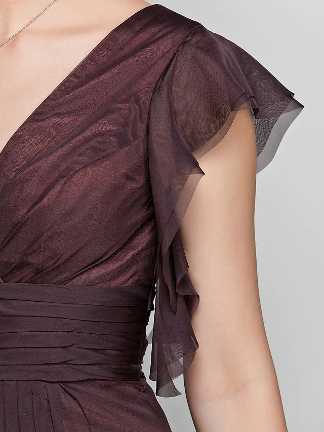Wholesale Mother of the Bride Dress Beautiful Back V Neck Floor Length Chiffon Short Sleeve with Criss Cross Ruched Draping - US 2 / UK 6 / EU 32