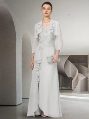 Wholesale Mother of the Bride Dress Elegant Jewel Neck Floor Length Chiffon Lace Length Sleeve with Ruffles Appliques