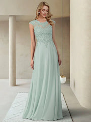 Wholesale Mother of the Bride Dress Elegant Jewel Neck Floor Length Chiffon Lace Short Sleeve with Pleats Appliques - US 2 / UK 6 / EU 32