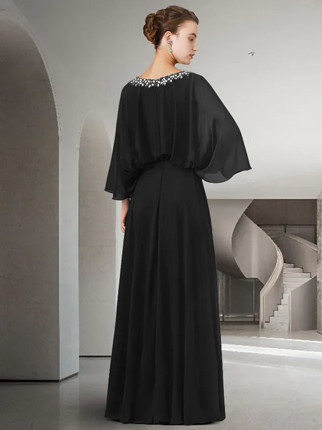 Wholesale Mother of the Bride Dress Elegant Jewel Neck Floor Length Chiffon Long Sleeve with Pleats Beading Split Front - US 2 / UK 6 / EU 32
