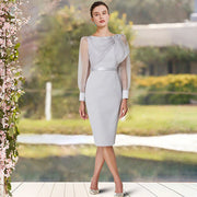 Wholesale Sheath / Column Mother of the Bride Dress Elegant Jewel Neck Knee Length Organza Stretch Chiffon Long Sleeve with Beading - US 2 / UK 6 / EU 32