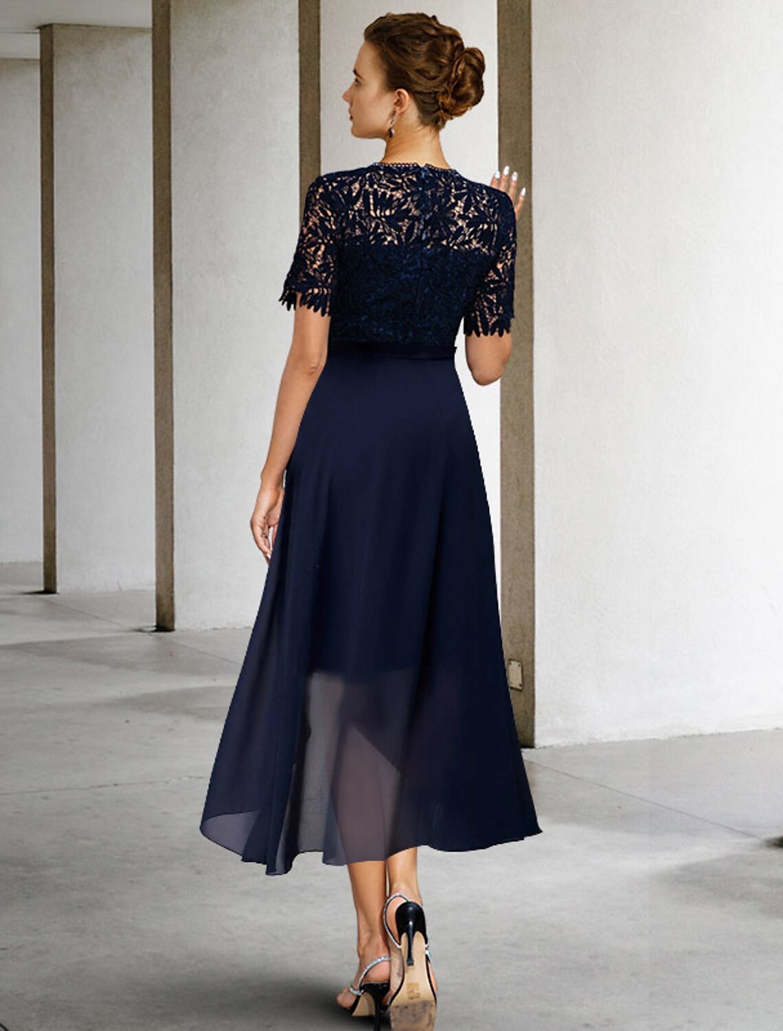 Wholesale Sheath / Column Mother of the Bride Dress Formal Wedding Guest Elegant Scoop Neck Knee Length Lace Short Sleeve with Bow(s) - US 2 / UK 6 / EU 32