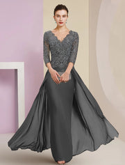 Wholesale Sheath / Column Mother of the Bride Dress Formal Wedding Guest Elegant V Neck Floor Length Chiffon Lace 3/4 Length Sleeve with Appliques - US 2 / UK 6 / EU 32