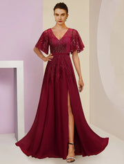 Wholesale Sheath / Column Mother of the Bride Dress Wedding Guest Elegant Sparkle & Shine V Neck Floor Length Chiffon Lace Sequined Short Sleeve with Pleats Split Front