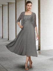 Wholesale Two Piece A-Line Mother of the Bride Dress Elegant Scoop Neck Floor Length Chiffon Lace Half Sleeve with Pleats Appliques