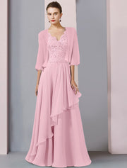 Wholesale Two Piece A-Line Mother of the Bride Dress Formal Wedding Guest Party Elegant V Neck Floor Length Chiffon Lace Half Sleeve Wrap Included with Beading Sequin Appliques