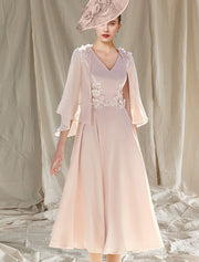 Wholesale Two Piece A-Line Mother of the Bride Dress Wedding Guest Church Elegant V Neck Tea Length Chiffon Sleeveless Wrap Included with Appliques