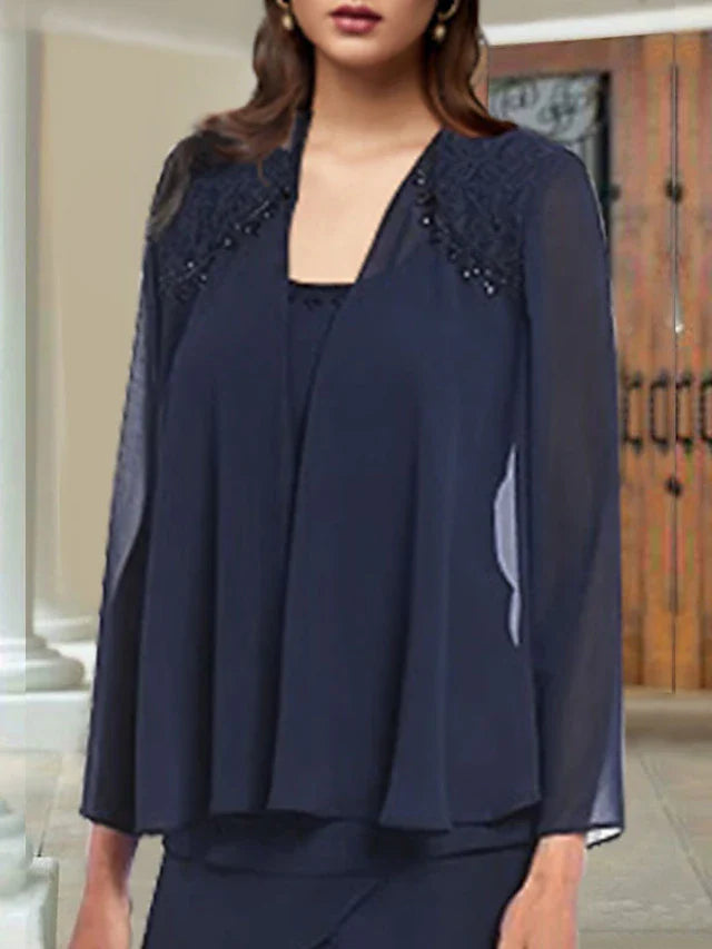 Wholesale Two Piece Sheath / Column Mother of the Bride Dress Elegant Scoop Neck Knee Length Chiffon Lace Sleeveless Wrap Included with Beading Ruffles