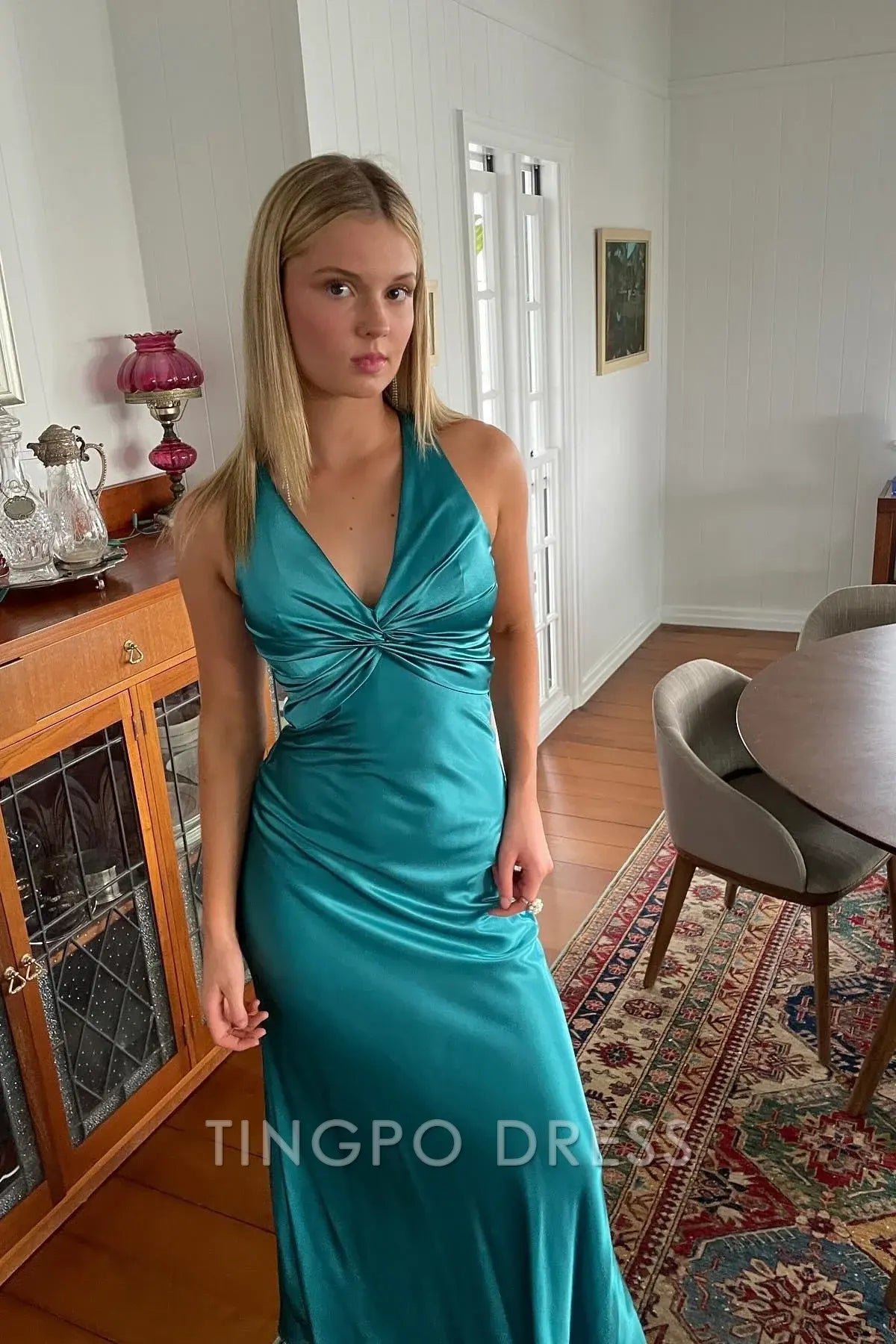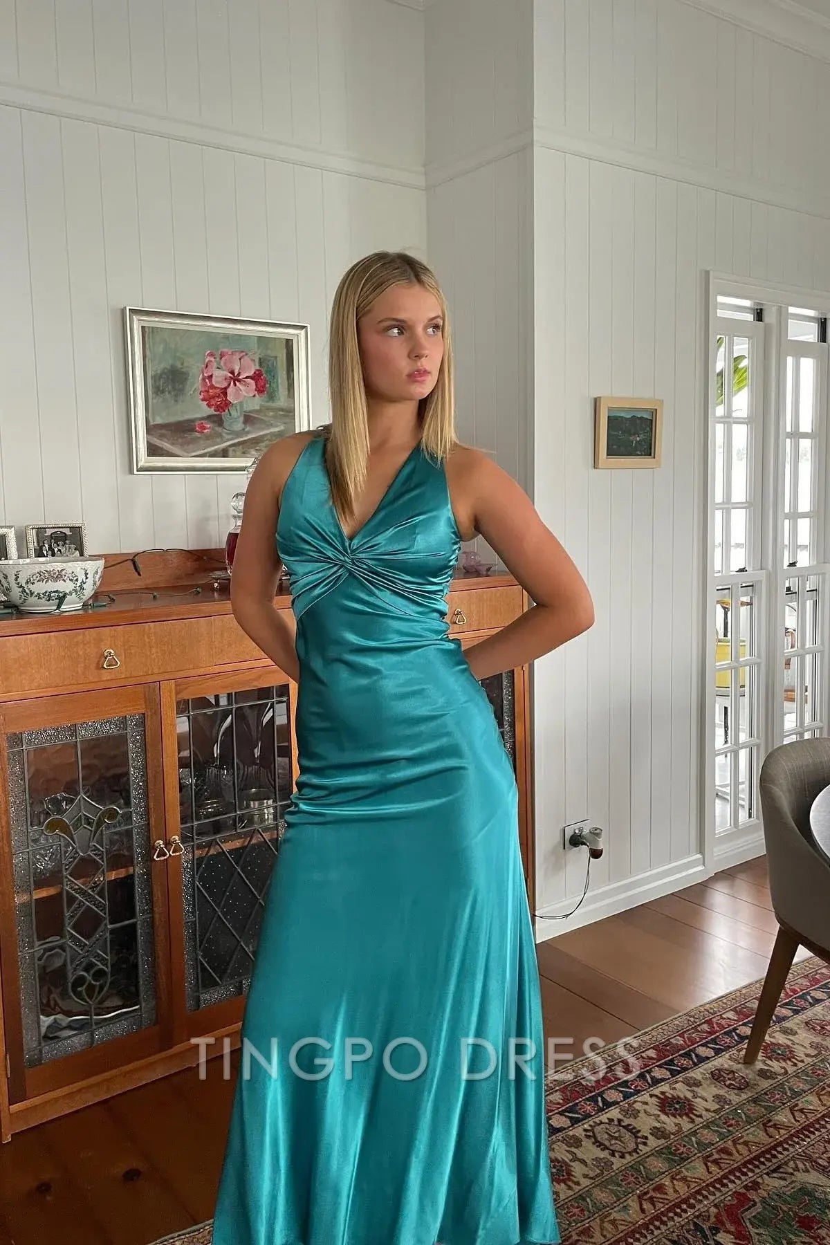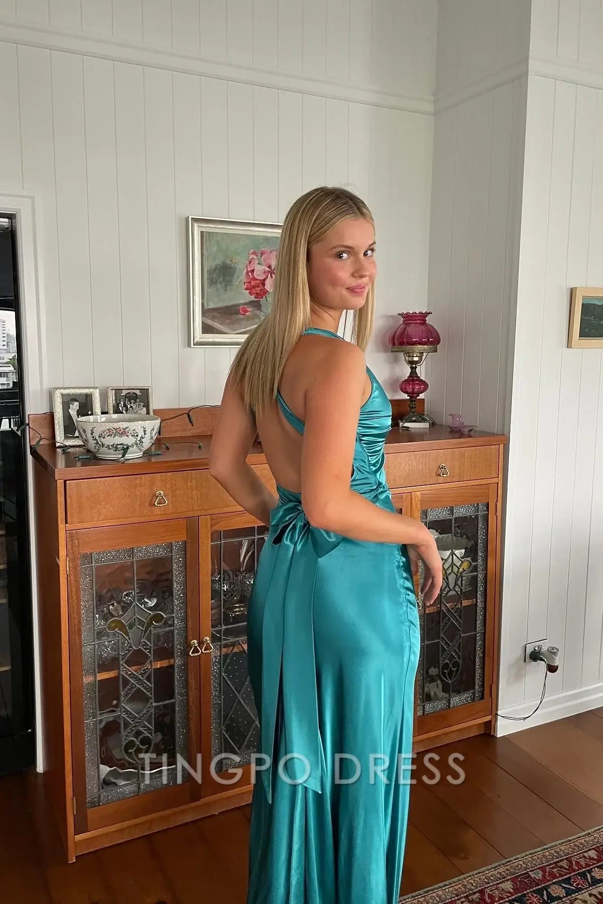 TingPo Wholesale Chic Sheath Halter Neck Yellow Long Party Dress with Backless Bowknot