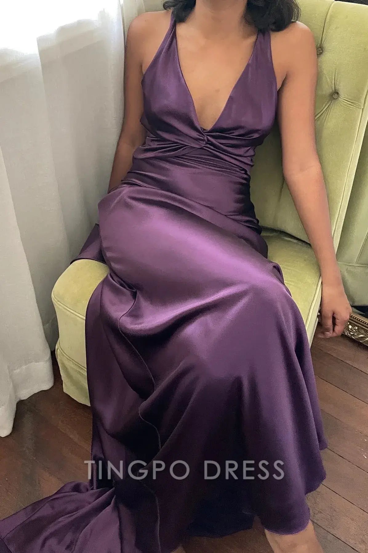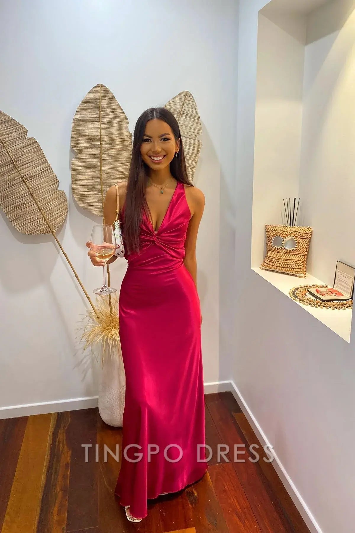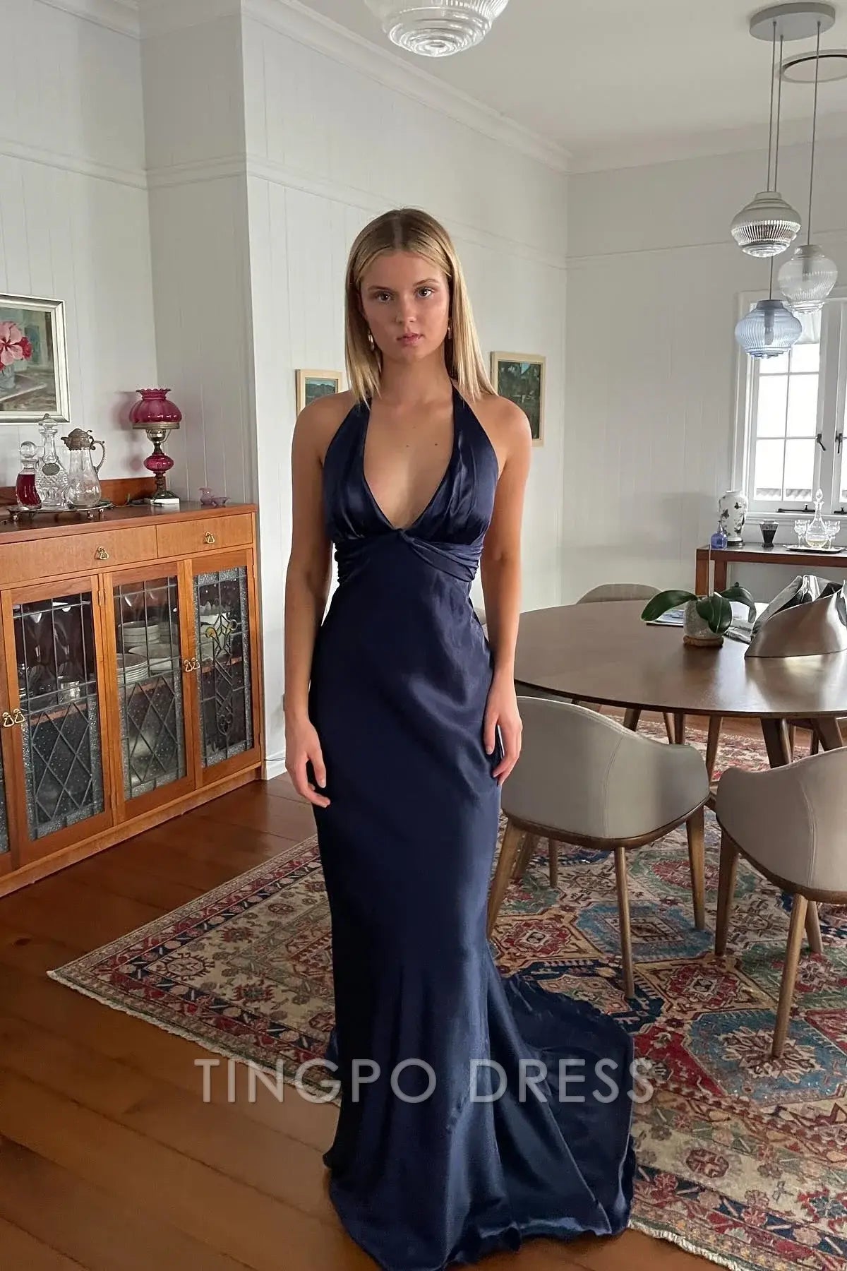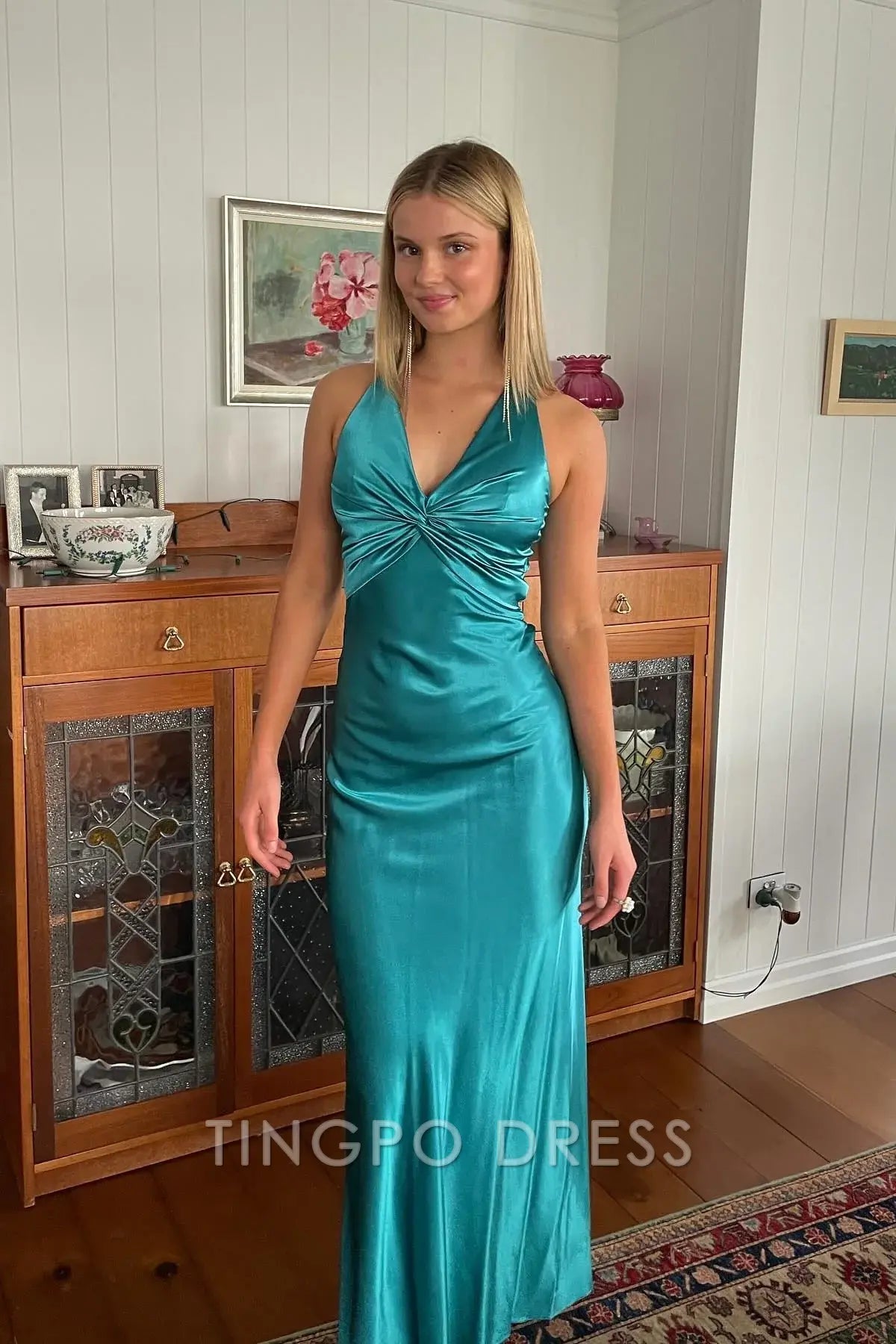 TingPo Wholesale Chic Sheath Halter Neck Yellow Long Party Dress with Backless Bowknot