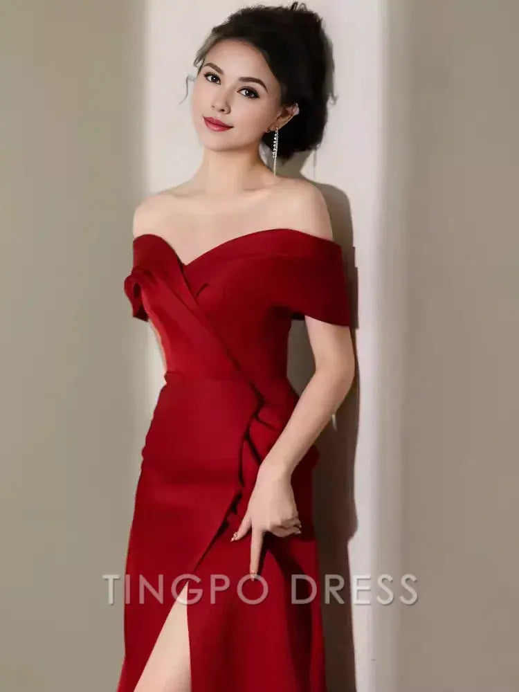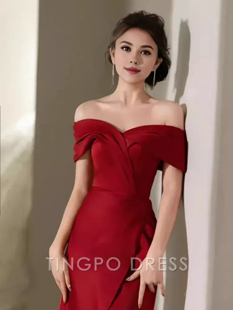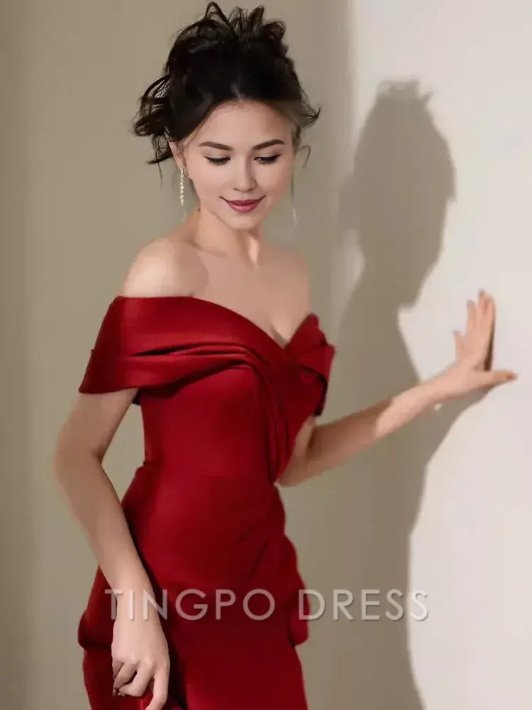 TingPo Wholesale Elegant Modest Mermaid Off The Shoulder Satin Red Prom Dress Long Evening Dress