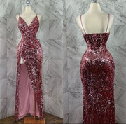 TingPo Wholesale Elegant Pretty Sheath Spaghetti Straps Sequin Long Prom Dresses Glitter Slit Evening Dress