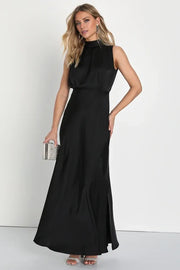 TingPo Wholesale Signature Elegance Black Satin Sleeveless Mock Neck Maxi Dress formal wear dresses