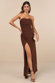 TingPo Wholesale Signature Elegance Epitome of Allure Brown Mesh Strapless Ruched Maxi Dress formal wear dresses