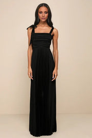 There are so many ways to look sensational, but wearing the TingPo Gorgeous Purpose Black Satin Pleated Sleeveless Bow Maxi Dress is the easiest! Sleek pleated woven satin shapes this stunning dress that features a sleeveless bodice, a square neckline, and slender tank straps (with one adorned with a matching pleated bow detail). The high, fitted waist tops a breezy, A-line skirt that cascades down to a sweeping maxi hem. Hidden back zipper/clasp.
