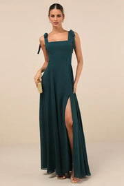 Let the Love Me Forever Emerald Green Tie-Strap Square Neck Maxi Dress take you on a romantic night out! Woven chiffon shapes this chic dress that has wide straps that tie together at the shoulders, supporting a square neckline. The princess-seamed bodice tops a flowy maxi skirt with a thigh-high slit at the front. Hidden back zipper/clasp.