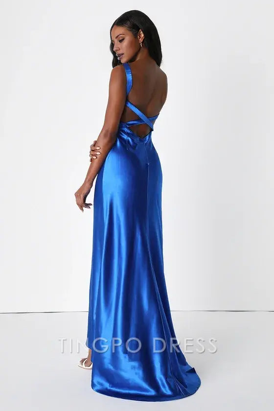 TingPo Wholesale Signature Elegance Perfectly Royal Blue Satin Strappy Maxi Dress formal wear dresses