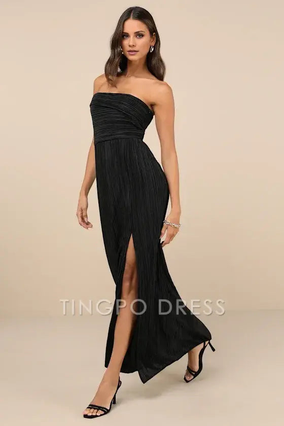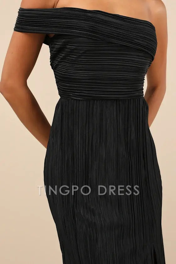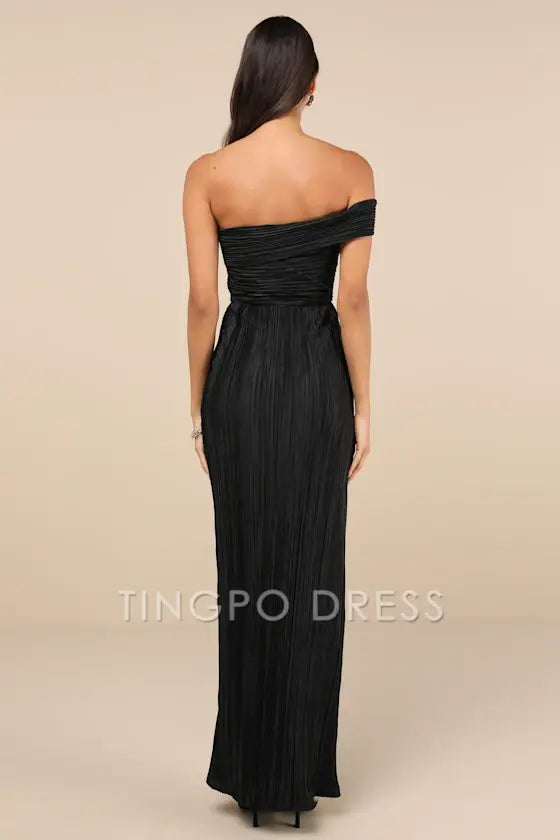 TingPo Wholesale Signature Elegance Performance Black Plisse One-Shoulder Maxi Dress formal wear dresses
