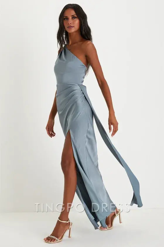 TingPo Wholesale Signature Elegance Slate Blue Satin One-Shoulder Maxi Dress formal wear dresses
