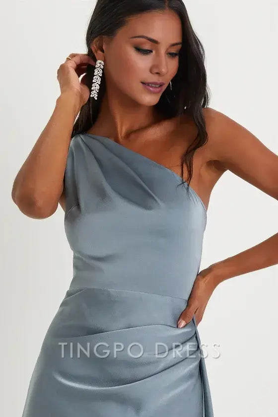TingPo Wholesale Signature Elegance Slate Blue Satin One-Shoulder Maxi Dress formal wear dresses - US 2 / UK 6 / EU 32