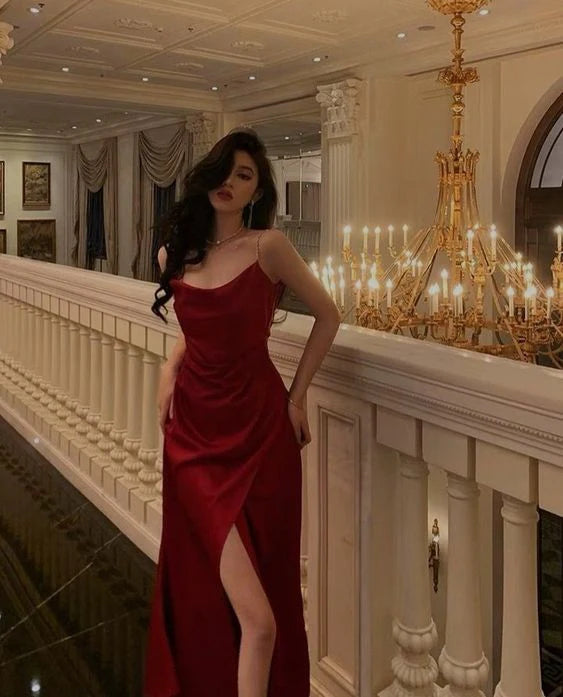 TingPo Wholesale Simple A line Straps Sleeveless Satin Red Prom Dresses Long Prom Dress
