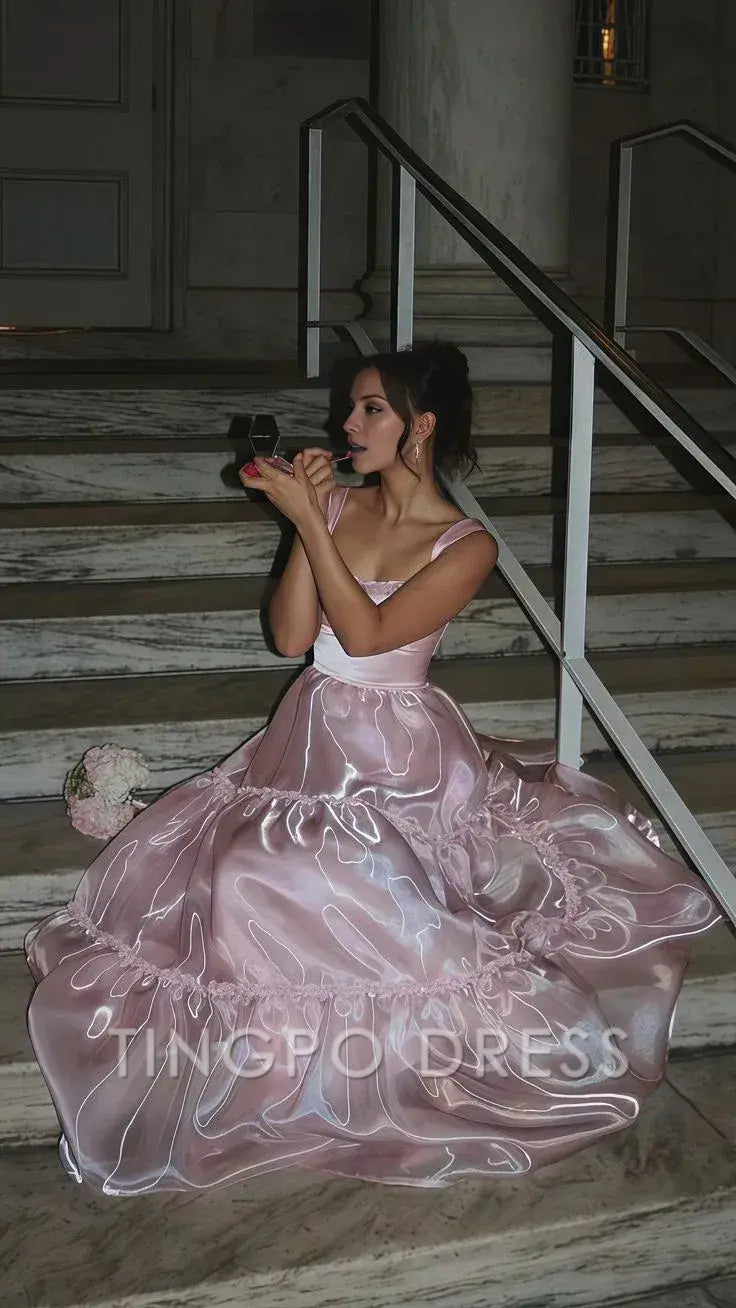 TingPo Wholesale Stylish A Line Spaghetti Straps Pink Long Prom Dress with Lace