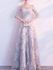 Wholesale A-Line Minimalist Elegant Prom Formal Evening Dress Jewel Neck Half Sleeve Floor Length Tulle with Pleats Appliques - US 2 / UK 6 / EU 32
