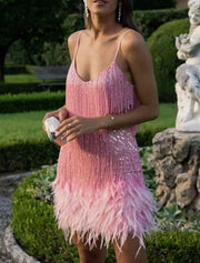 Wholesale A-Line Party Dresses Sparkle & Shine Dress Prom Wedding Party Short / Mini Sleeveless Spaghetti Strap Sequined with Feather Fringe Sequin - Pink / US 2 / UK 6 / EU 32